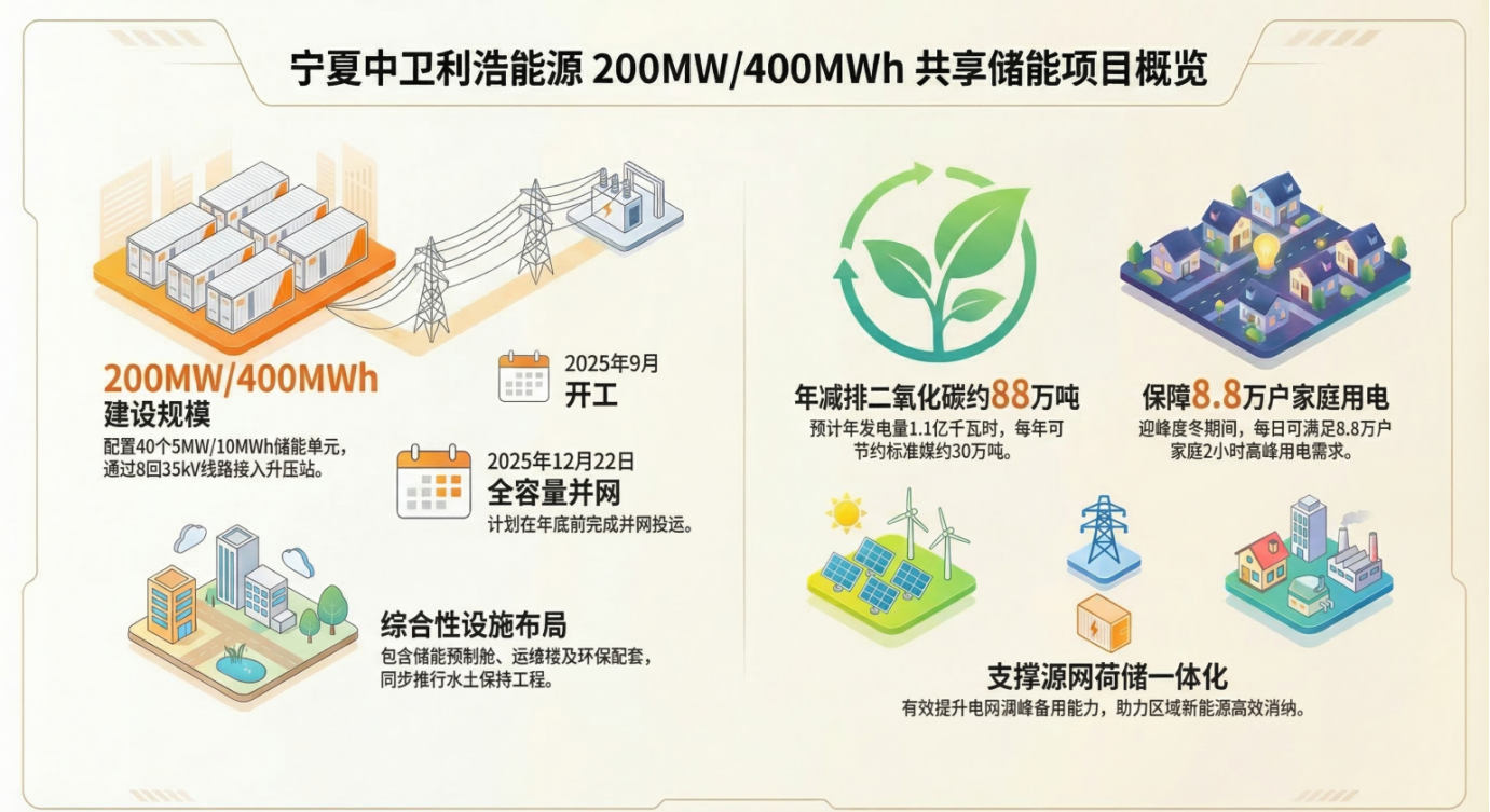 宁夏中卫共享储能项目(凯发K8国际冷热实施项目):200MW/400MWh,年发电量1.1亿千瓦时,省煤30万吨,减排88万吨,保障8.8万户高峰用电。